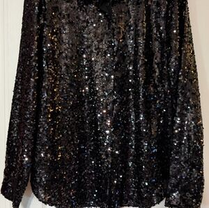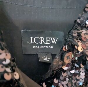 Add some sparkle to your wardrobe with this J.CREW Collection dark navy (almost black) sequin shirt. The classic fit shirt features a collared neckline, long sleeves with a classic/fitted sleeve type, and a button closure. It is perfect for any festive or holiday occasion and is made of polyester material with sequin accents. The shirt is lined. It is machine washable.