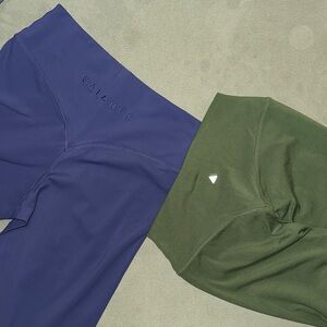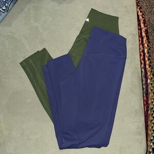 Two like new pair of green and blue athletica Balance leggings. Retails $55 each. Selling both for $50 altogether. Blue is large; green is medium, but in my humble opinion they both fit like a small/mediumish. Stretchy, of course, and super cute, but Iโm a solid LARGE in leggings. ๐