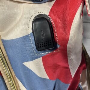 Mommy loves me diaper backpack with changing pad and convertible changing table. Has an integrated usb charger inside large main compartment with another diaper organizer pocket in front. The back pocket is the changing table/pad. This is a nice looking bag that seems very functional. Would be great for travel! This item is in like new condition and I don't usually say that but it's very clean!