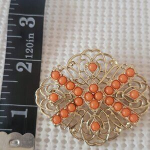 Sarah Coventry Signed Gold Tone Filgree Orange Cabochon Bead Oval Pin Brooch