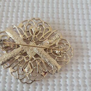 The Sarah Coventry Signed Gold Tone Filgree Orange Cabochon Bead Pin Brooch is a vintage piece of fashion jewelry that features a beautiful oval-shaped orange cabochon stone set in a gold tone base metal. This brooch is signed by Sarah Coventry, a well-known brand in the United States jewelry industry, and is perfect for everyday wear. Its unique design and high-quality materials make it a standout accessory for women looking to add a pop of color to their outfit