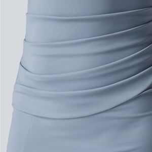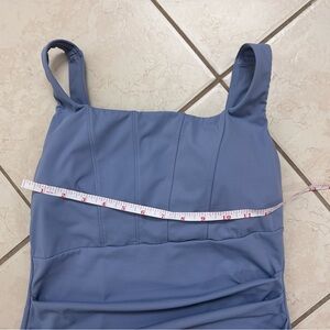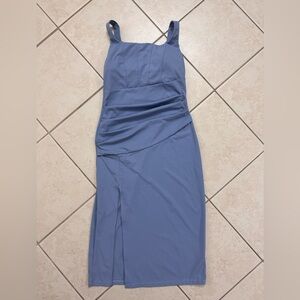 This elegant grey/blue sleeveless dress is perfect for any occasion. Its sleek design and flattering fit make it a must-have in your wardrobe. Featuring built in bra cups, and corset look.