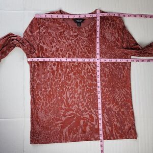 Simply Vera Vera Wang Top Texture Crewneck Long Sleeve Tee Knit Rust - Size M, approx. measurements in pics - Textured finish - Crewneck - Long sleeves - Jersey construciton - 76% Polyester, 17% rayon, 7% spandex - Pre-owned Shipping Same or Next Business Day! Thanks for watching! Long Sleeve shine casual cute classy Party dinner career, office, workwear, top sweater knit lightweight top party, night out, date top blouse pullover casual business meeting career office workwear animal print leopard print sweater popover top knitted casual stretchy