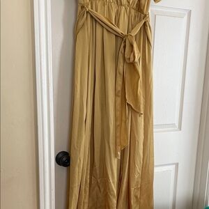 Elegant gold dress with a wrap style. Features short flutter sleeves and a tie waist. Very pretty and comfortable. Never worn, only tried on. Make an offer!