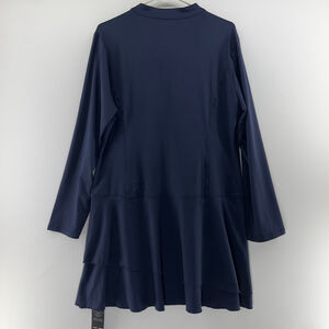 New with tags!! Jack Smith women's long-sleeve athletic dress in navy blue, size 2XL. It features a V-neck with a small stand-up collar and a fitted bodice with vertical seams. The lower portion has a tiered, ruffled design. The fabric composition is 90% Polyester and 10% Elastane. One image shows a side pocket on the skirt portion, capable of holding a phone. The sleeves are long with simple cuffs.