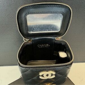 Mini vanity in black quilted design. Features gold chain and logo. Stylish and versatile.