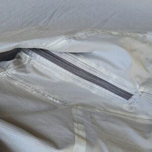 Coated, watertight center front zipper and welted, DWR (durable water repellent)-treated venting pit zips