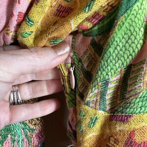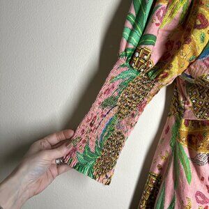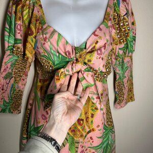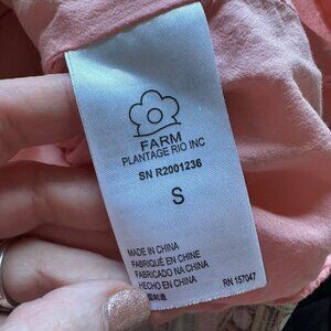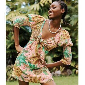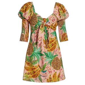 Farm Rio Mixed Fruits Mini Smocked Tropical Linen Blend Dress - Size Small Color: Pink MSRP: $200.00 Worn once or twice Smocked 1/2 Sleeves Side Zip Closure Self-Ties At Front Fully Lined Linen Blend Puff sleeves Lined 16.5” across the chest 16” across the waist 19” across the hips 33.5” long See photos for additional details.