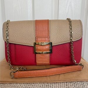 Exterior is indigo blue denim. Gold toned snaps to sides of the bag. Gold toned feet to bottom of the bag.