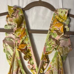 Vibrant floral dress by Urban Outfitters. Features pink, green, and yellow tones. Ideal for a fresh look. 0065