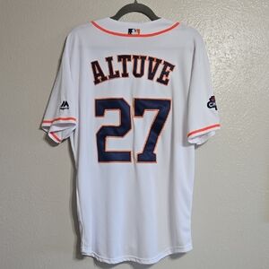 2017 Houston Astros #27 Altuve jersey in white with bold orange trim. Features team logo and championship patch. Excellent condition!
