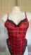 Vintage 80’s Plaid Tartan Red! Black Lace Trim Snaps Bodysuit! Size S