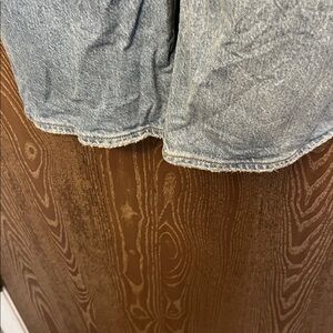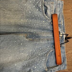 High rise 90’s straight Light blue denim with subtle embellishments. Features tan stitching and button details.