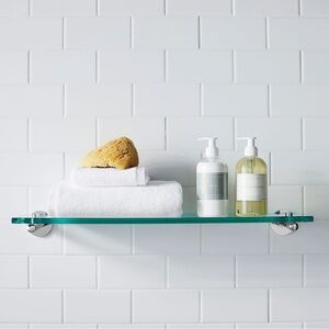 Elegant glass shelf with silver brackets. Perfect for bathroom decor.