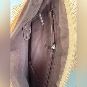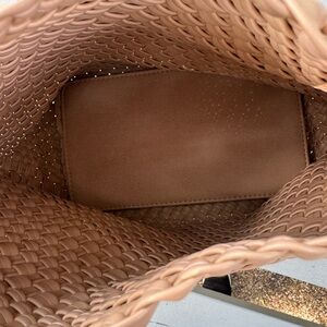 Elevate your style with this brand-new large woven tote bag crafted from soft vegan leather in a versatile beige hue. Perfect for everyday use or travel, it offers roomy storage and a chic woven texture. Includes a matching small clutch for added convenience—ideal for carrying essentials or using on its own.