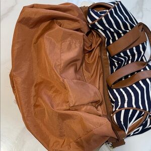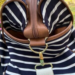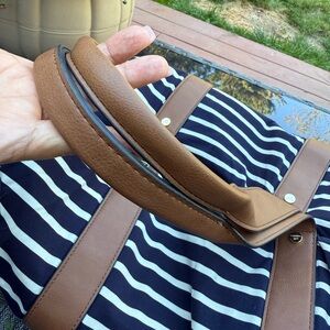 Chic tote with navy and white stripes. Brown trim and gold accents. Ideal for daily use.