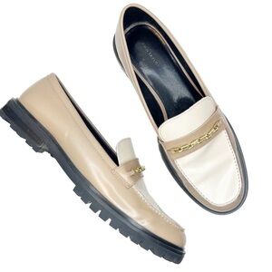 Chic loafers with a cream and tan design. Gold chain detail for added elegance. Perfect for versatile styling. Great condition.