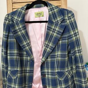 Elegant navy blue coat with intricate cream embroidery. Features floral and geometric patterns.