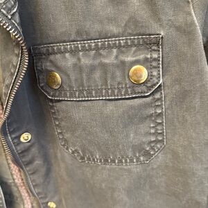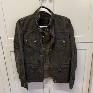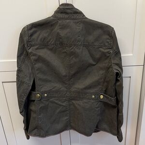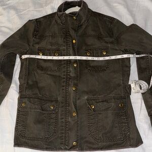 Stylish olive green jacket. Features gold button accents. Perfect for layering. Chest dimensions approx 19”. See pic. Also adjustable snaps in back!