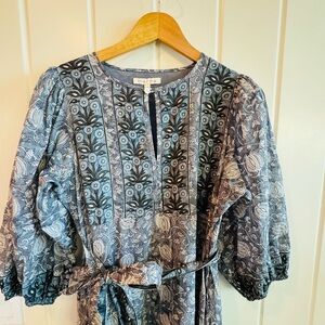 Beautiful blockprint Marea dress with a blue floral pattern. Features a tie waist and long sleeves. Perfect for any occasion. Only worn twice. Would be great with sandal, flats or boots for fall!