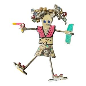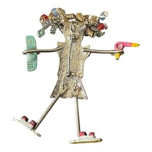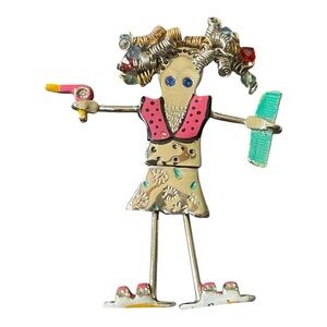 Quirky and fun vintage brooch from the collectible They’re Brats line by Carrette Ltd. for Ganz. This whimsical piece features a girl with curly wire hair, rhinestone eyes, and enamel accents. She holds a turquoise comb in one hand and a pink hairdryer in the other, with articulated arms and legs that move for playful character.