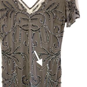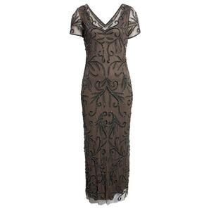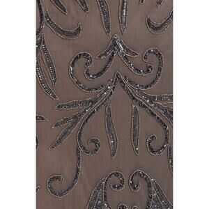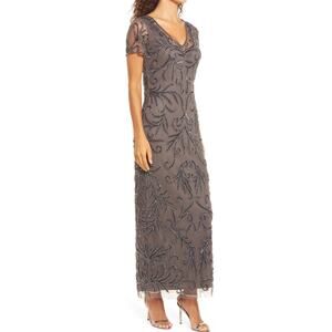 NWOT Pisarro Nights Illusion Beaded Mesh Maxi Gown Dress in Aluminum, Size 6