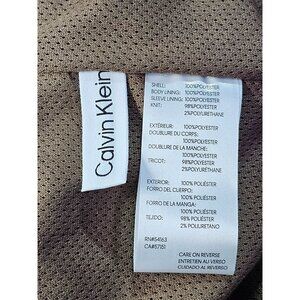 Calvin Klein men's bomber jacket, crafted from sleek polyester, exudes timeless style with its versatile brown hue. The jacket features functional zipper pockets and ribbed cuffs, offering both practicality and a classic silhouette. Ideal for transitional weather, its lightweight construction ensures comfort without compromising on warmth. A perfect addition to your wardrobe.