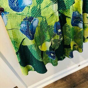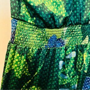 This White House Black Market hi-lo maxi dress is the perfect blend of elegance and statement style. Featuring a smocked waist for a flattering fit, this sleeveless dress flows beautifully with every step. The green and blue floral print pops against the silky satin fabric, giving it a fresh, resort-ready vibe.