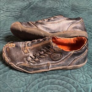 Stylish black shoes with orange interior. Unique stitching and lace design.