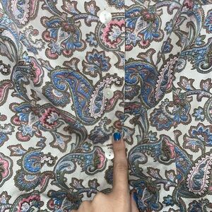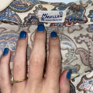 Vintage McMullen colorful paisley button up blouse with a classic collar. Cinches slightly at the waist and is perfect for fall workwear or casually. Tiny discoloration, see last pic