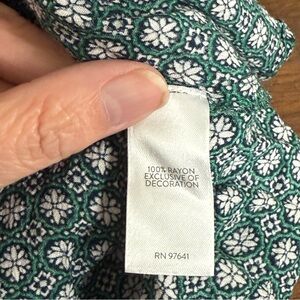 Chic and versatile J. Jill 2X boho-style tunic blouse in a rich green and ivory geometric floral print. Features a button-down front, long sleeves, and lightweight flowy fabric for a flattering drape. Perfect for fall layering, office wear, or weekend casual chic. Designed for all-day comfort while staying stylish.
