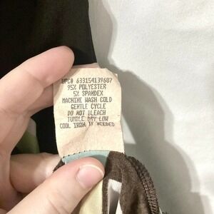 Tempted Hearts brand. Size women's extra large. Banded brown across top and bottom hem, scoop neck, ties at the top of the back, and keyhole design in the back. Elastic at hips. Fabric is somewhat thin; can vaguely see hand when placed underneath fabric. In preloved condition, no visible defects (see photos for condition, if applicable); as with any preowned clothes, you should wash before wearing the first time. Made of 95% polyester, 5% spandex. From a pet friendly home.