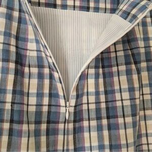 Color: Roman Linear Plaid exterior (Blue, Ivory, Yellow, Black) with a striped inside lining (Blue & White)