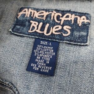 Americana Blues Denim Crop Jacket Faux Fur Details Size L. Approx: 36 inch chest, 23 inch sleeve, 16 inch length. Please see photos for details. Great pre-owned condition. No holes no fading no stains