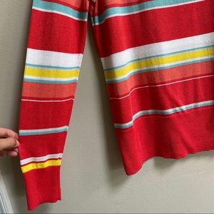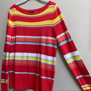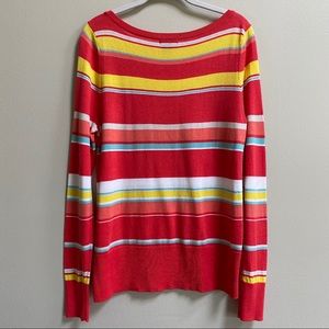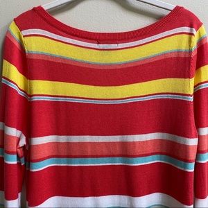 Colorful, striped knit top from Halogen. Lightweight sweater fabrication. Ribbed boat neck. Ribbed hem and cuffs. Pictures show more of a red color, but it is actually a watermelon and coral color with aqua, yellow, and white stripes.