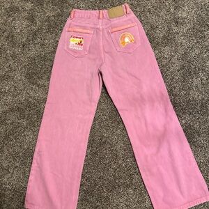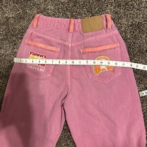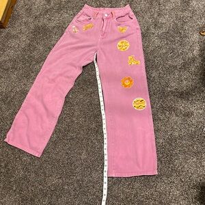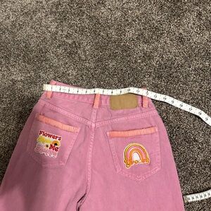 Chic pink high rise jeans. Adorned with vibrant patches. Ideal for a stylish outfit. These are one of a kind Hand Crafted by Redhawk Designs with deerskin lace & Patches. Measurements are pictured