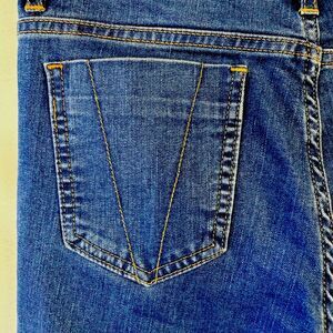 Victoria Beckham skinny straight mid rise jeans. Designer detailing, branded copper rivets, leather patch, tobacco topstitching.