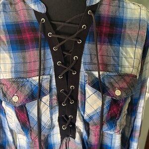 Express Blue Plaid Lace-Up Shirt