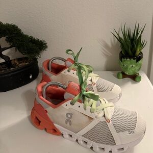 Stylish and comfortable On Running sneakers. Beige upper with lime accents. Ideal for casual wear.