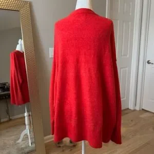 Bold orange-red knit sweater with oversized silhouette, crew neckline, and long sleeves. Features ribbed cuffs and hem with soft, brushed feel. Relaxed, cozy fit.