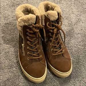 EUC Cougar Brand Women’s Brown Suede Sneaker Boots with Leopard Print