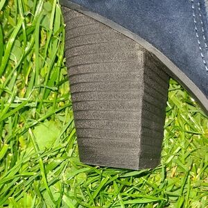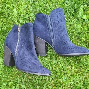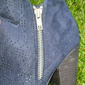 Chic navy booties with perforated design. Side zipper for easy wear. Stylish and versatile.