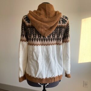 Warm knit cardigan with a charming pattern in black, browns and white/cream colors. Features llamas as part of the pattern.