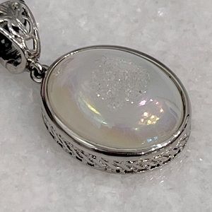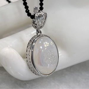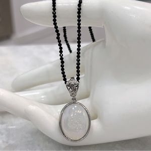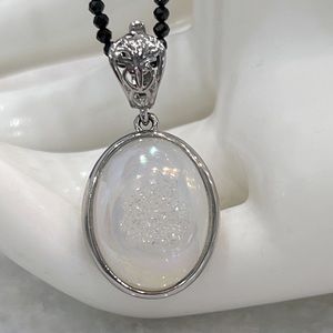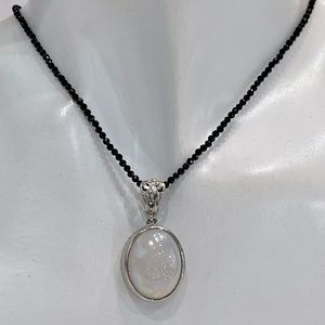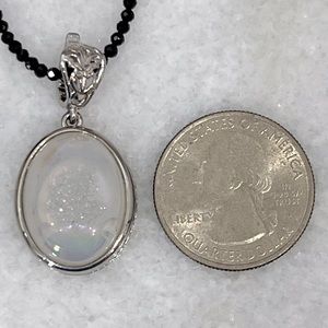 Oval Pearl shimmer drusy Quartz pendant set in stainless steel with Thai Black spinel beaded necklace. Drusy pendant has a shimmery iridescent hue to it and picks up shades of pink, green, and yellow