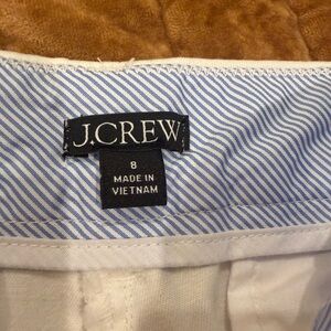 The product is a pair of J Crew white chino shorts in size 8. They feature a flat front design, making them a classic and preppy addition to any summer wardrobe. The shorts are in excellent condition, ensuring they are in top quality for the buyer. Perfect for various vacation-core looks, these shorts are a versatile and stylish piece that can be dressed up or down with ease.