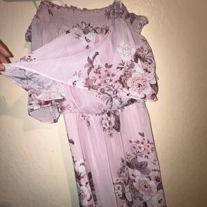 Like new,only worn once. Off the shoulder purple dress. Has a long slit on the side. Has an under fabric. Size is a medium 10.