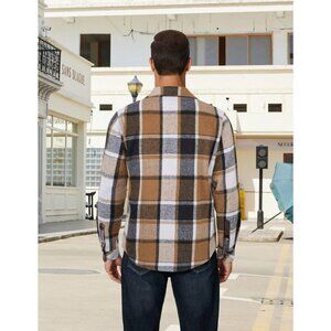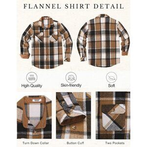 CLASSIC & FUNCTIONAL DESIGN: The shirt jacket features a timeless plaid pattern with a brown contrast placket, collar, and cuffs. The button-down collar and two convenient chest pockets enhance its everyday practicality and casual rugged vibe