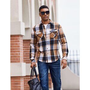 Coofandy Men Khaki-black Flannel Plaid Button Down Jacket Shirt with Pockets