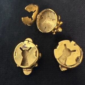 Popular in the 80's and early 90's, this set of three button covers are a classic addition to any jewelry collection. The gold tone metal provides an elegant contrast to the faux pearls, making them perfect for adding a touch of sophistication to any outfit. The button covers are versatile and can be worn on a shirt or blouse to cover existing buttons. The set is perfect for those who love vintage or retro style jewelry.