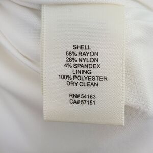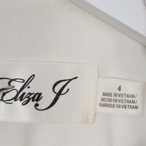 Add a touch of elegance to your wardrobe with this stunning Eliza J dress. Featuring a solid pattern, 3/4 bell sleeves, and a round neckline, this dress is perfect for any occasion - from weddings to formal events. The dress has a zip closure and is made of a ponte knit fabric comprising of polyester, nylon, spandex, and rayon. It has a white color with black trim accents and is lined with stretch for added comfort. The dress has a tiered fit and flare design with a dress length of 35 inches and a bust size of 16 inches flat lay. It's a regular size and is suitable for women. The dress is perfect for any season, be it winter, summer, fall, or spring.